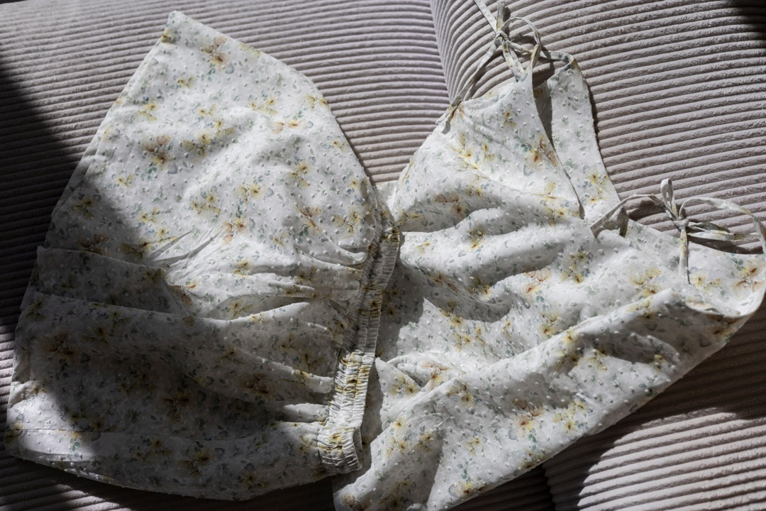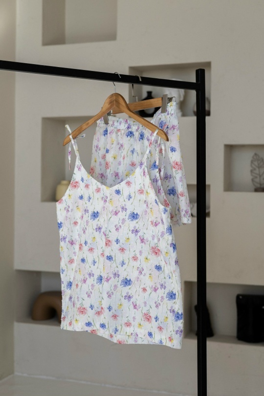 Топ из нежного батиста с акварельным цветочным рисунком. Тонкие завязки на плечах позволяют регулировать посадку, а свободный крой создаёт ощущение лёгкости и уюта. В нём легко почувствовать настроение весны — даже посреди будничного утра.