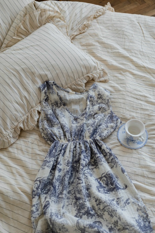 Платье, которое переносит в атмосферу французского утра. Лёгкий хлопок с изысканным принтом в стиле toile de Jouy окутывает мягкостью и даёт телу свободу. Крой и высокий разрез делают силуэт лёгким и женственным. В нём хочется медленно заваривать кофе, читать любимую книгу у окна и ощущать себя героиней красивого романа.