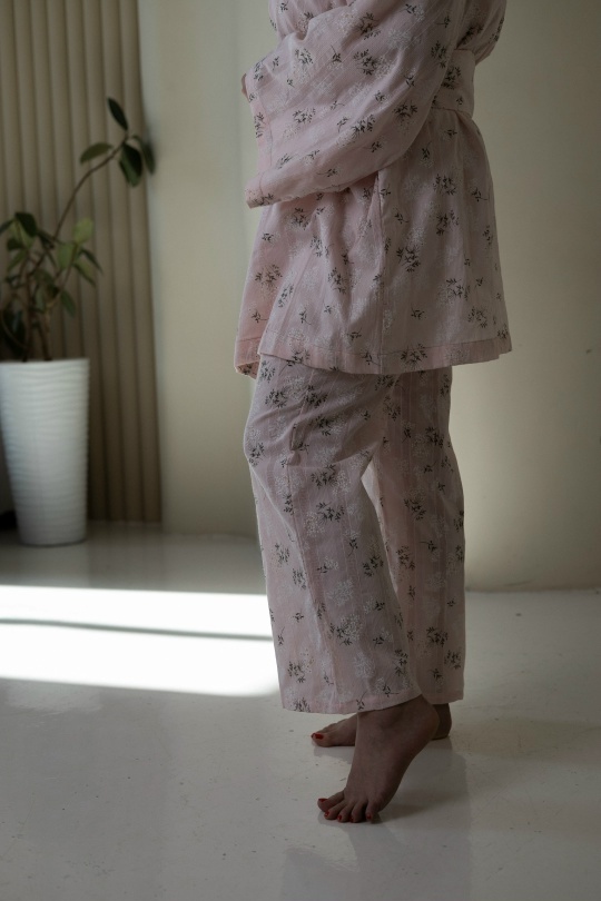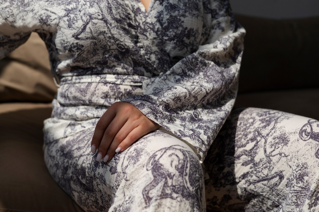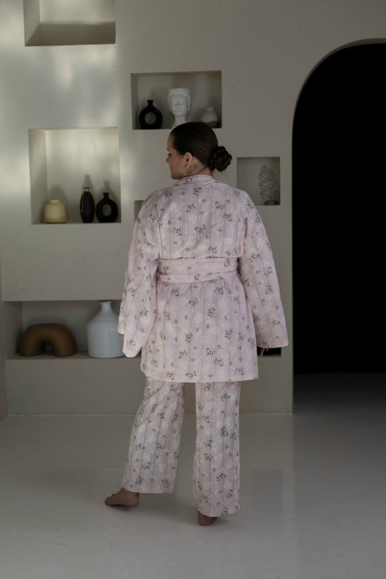 В паре кимоно и брюки превращаются в цельный образ, в котором можно и завтракать дома, и встретить гостей, и просто наслаждаться красотой момента.