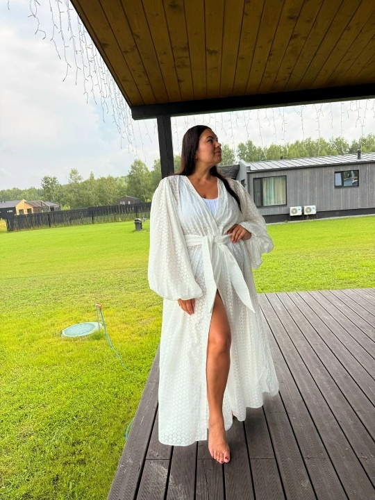 Воздушный халат из батиста с объёмными рукавами — как нежное прикосновение, в которое хочется закутаться. Легкая ткань струится по телу, создавая ощущение невесомости.