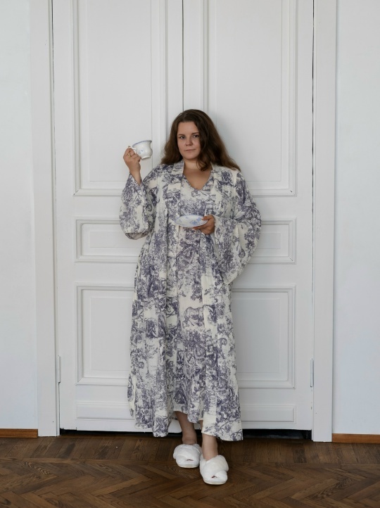 Лёгкий и изысканный халат с принтом toile de Jouy создан, чтобы превратить каждое утро в маленький ритуал. Свободный силуэт, мягкий хлопок и воздушные рукава дарят комфорт, а изящный орнамент добавляет ощущение утонченности. Наденьте его поверх платья или домашнего комплекта — и даже обычное чаепитие превратится в момент красоты и спокойствия.