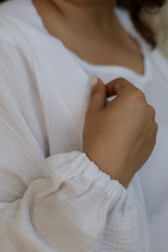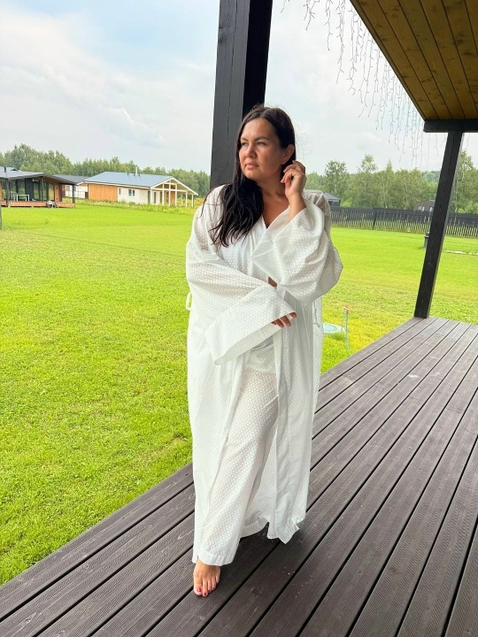 Невесомый халат, словно облако, которое окутывает вас мягкостью. Он станет вашим спутником после душа, в медленное утро или тёплый вечер с книгой. Завязывается на пояс, подчеркивая талию, и придаёт образу элегантность. Белоснежный муслин делает каждое прикосновение особенным.