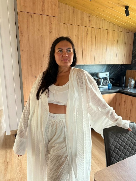 Широкие рукава создают эффектный силуэт, а легкость ткани делает его идеальным выбором для дома, отдыха или утреннего кофе.